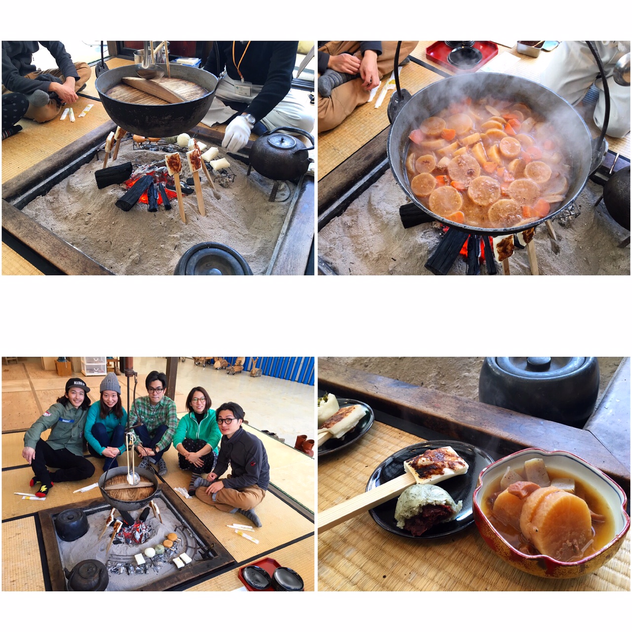 大根煮、そして囲炉裏の炭火で焼くモチなどの郷土料理を堪能。