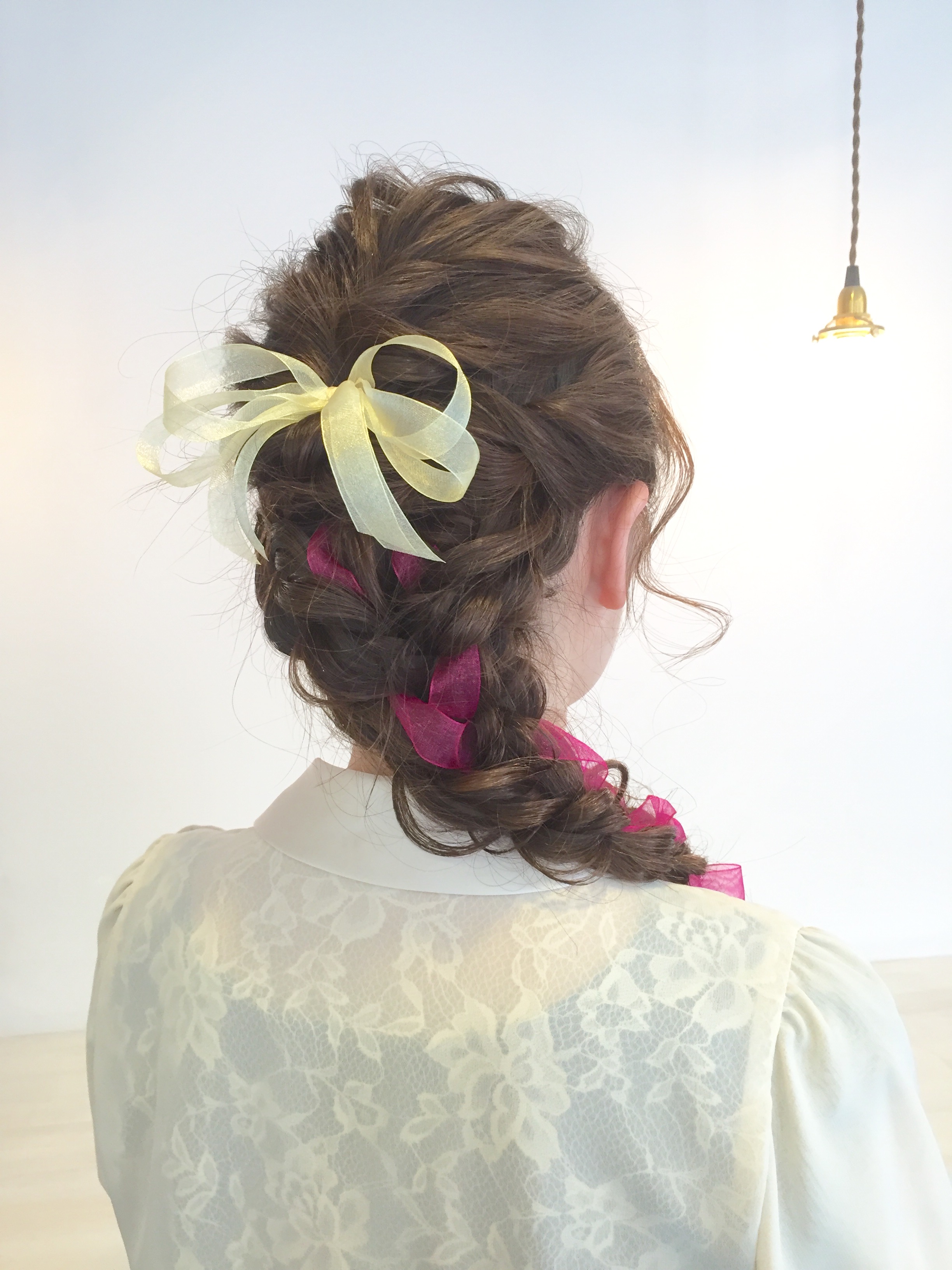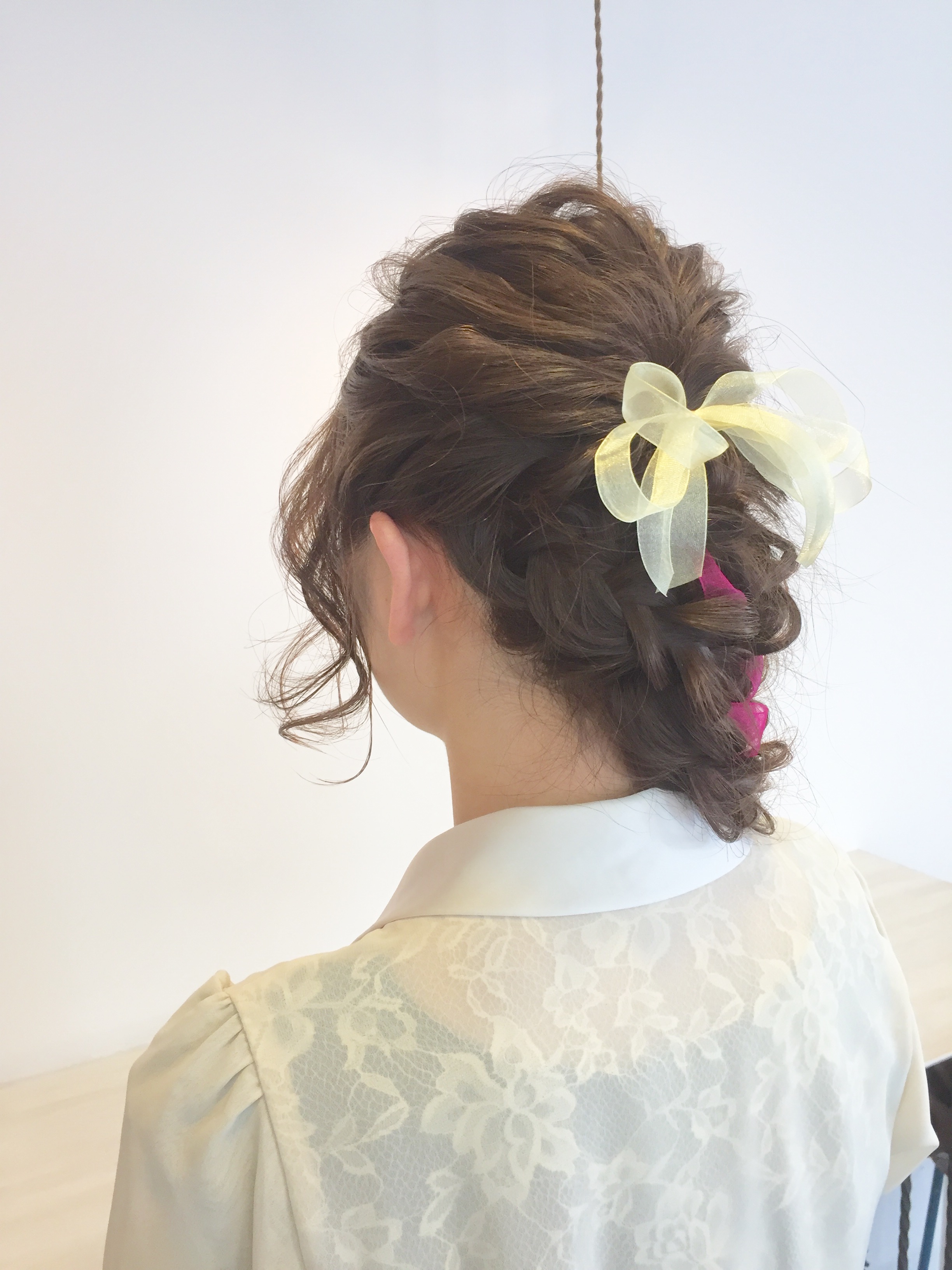 asuka’s arrange コメントを残す こんにちはヤマザキです(^^)/ 本日のお呼ばれセットのお客さま(^^) 持ち込みのリボンで編み込みアレンジに お髪も長いので一緒に編みながらサイドでまとめました♪ 後ろはもちろん、横、前、どこから見ても華やかで とってもかわいかったです( *´艸`) ご来店ありがとうございました!!