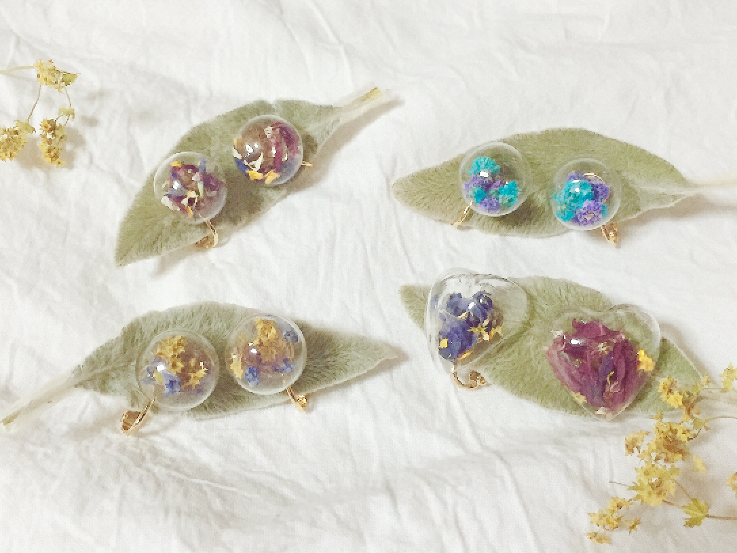NEW* コメントを残す こんにちはヤマザキです(^^)/ いつもとはちょっと違う新しいラインの新作アクセサリーです♪ 実家の庭で摘んだお花のドライをガラスドームに閉じ込めたアクセサリー どなたにも使っていただけるようにすべてイヤリングになります* すべてアソートになりますがこれからどんどん種類を増やしていく予定です☆ 是非お手に取ってご覧下さい(^^)