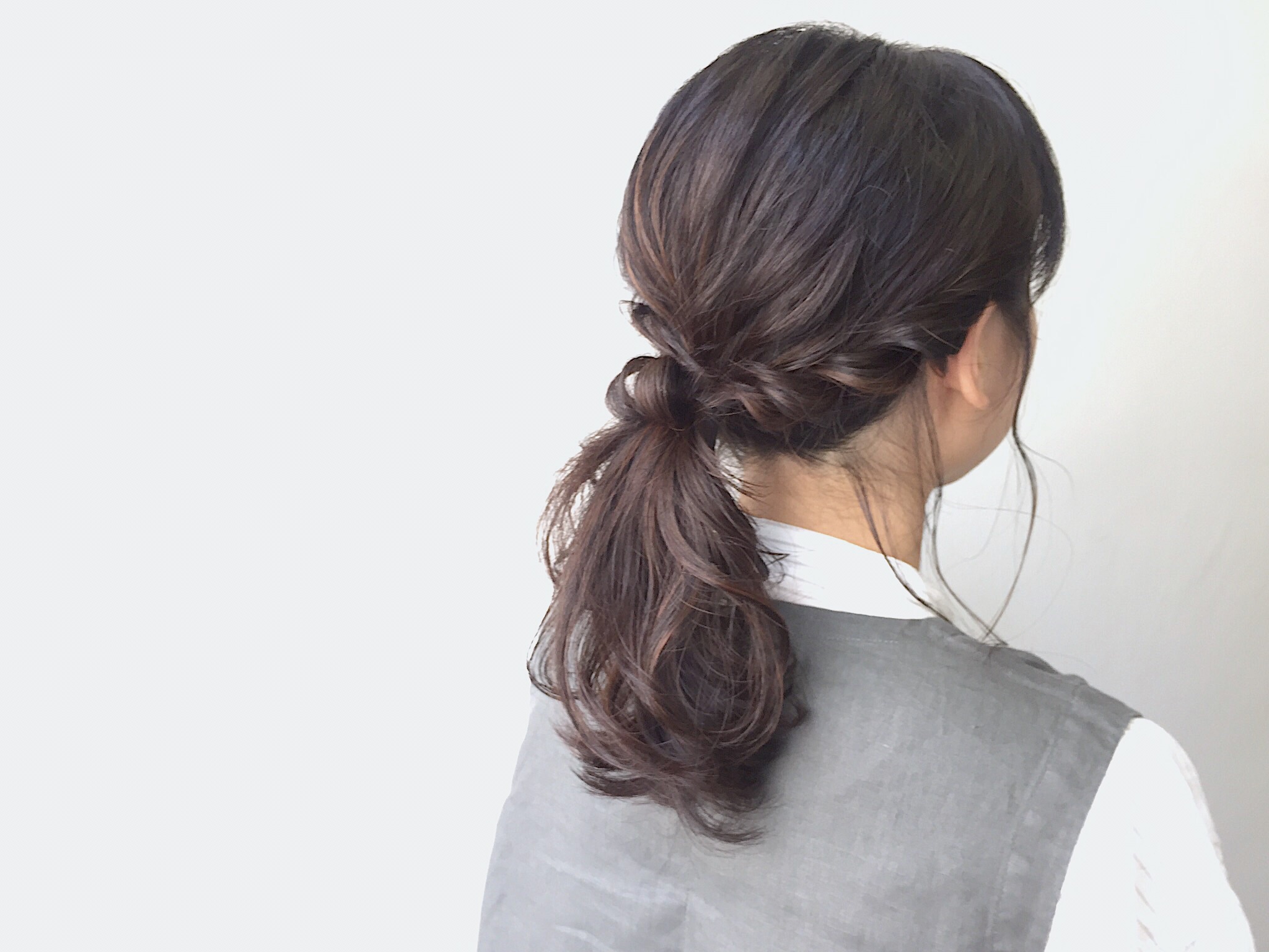 一つに束ねたゴムが見えないようにくるっと毛束を巻いてあります◎