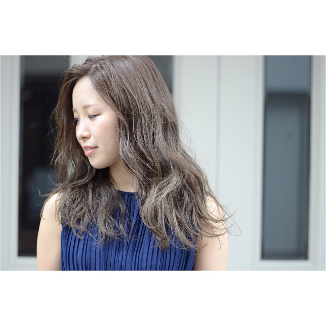 ブリーチ後、根元は暗めなアッシュグレーを入れ、毛先に行くに従い明るく透明感のある