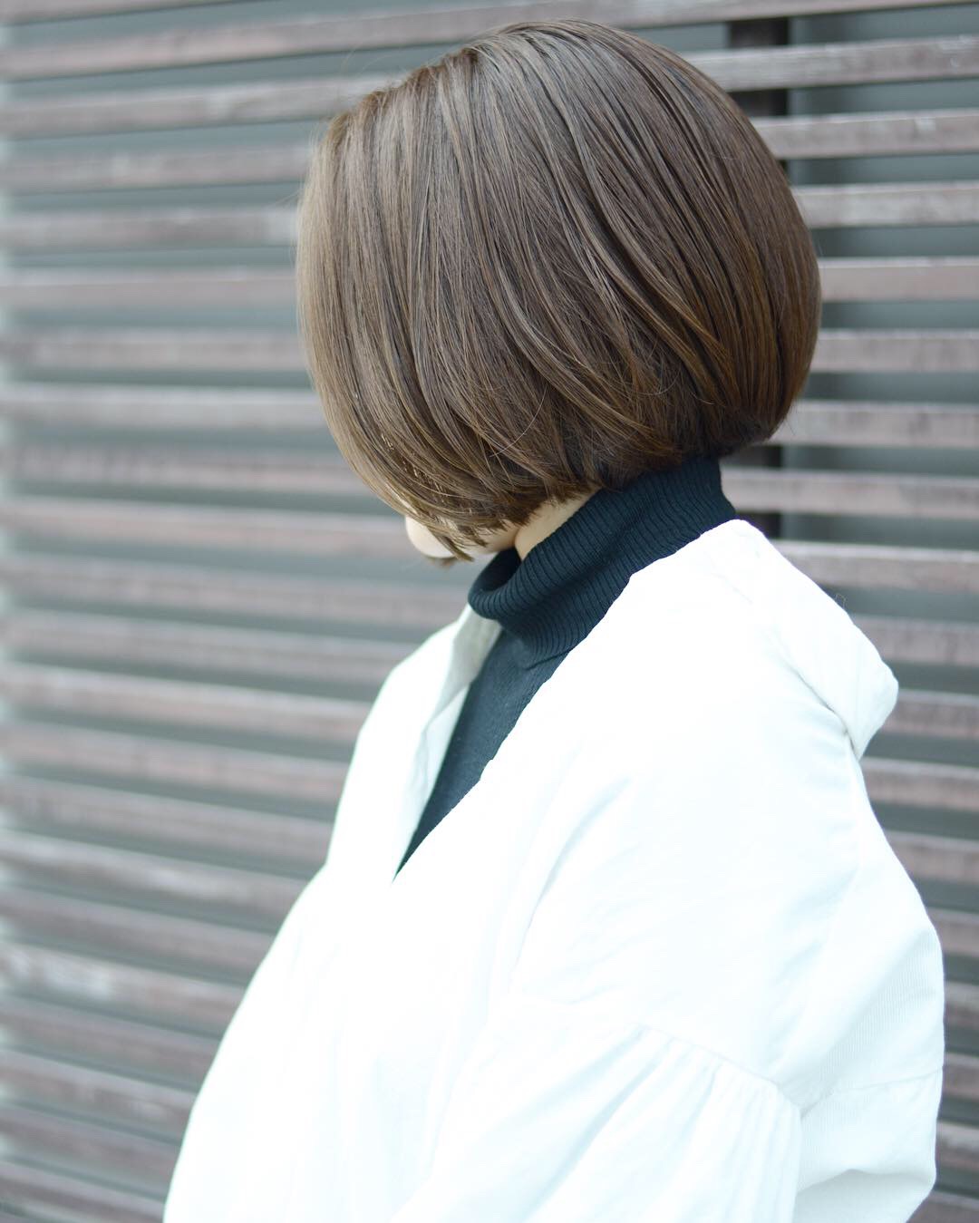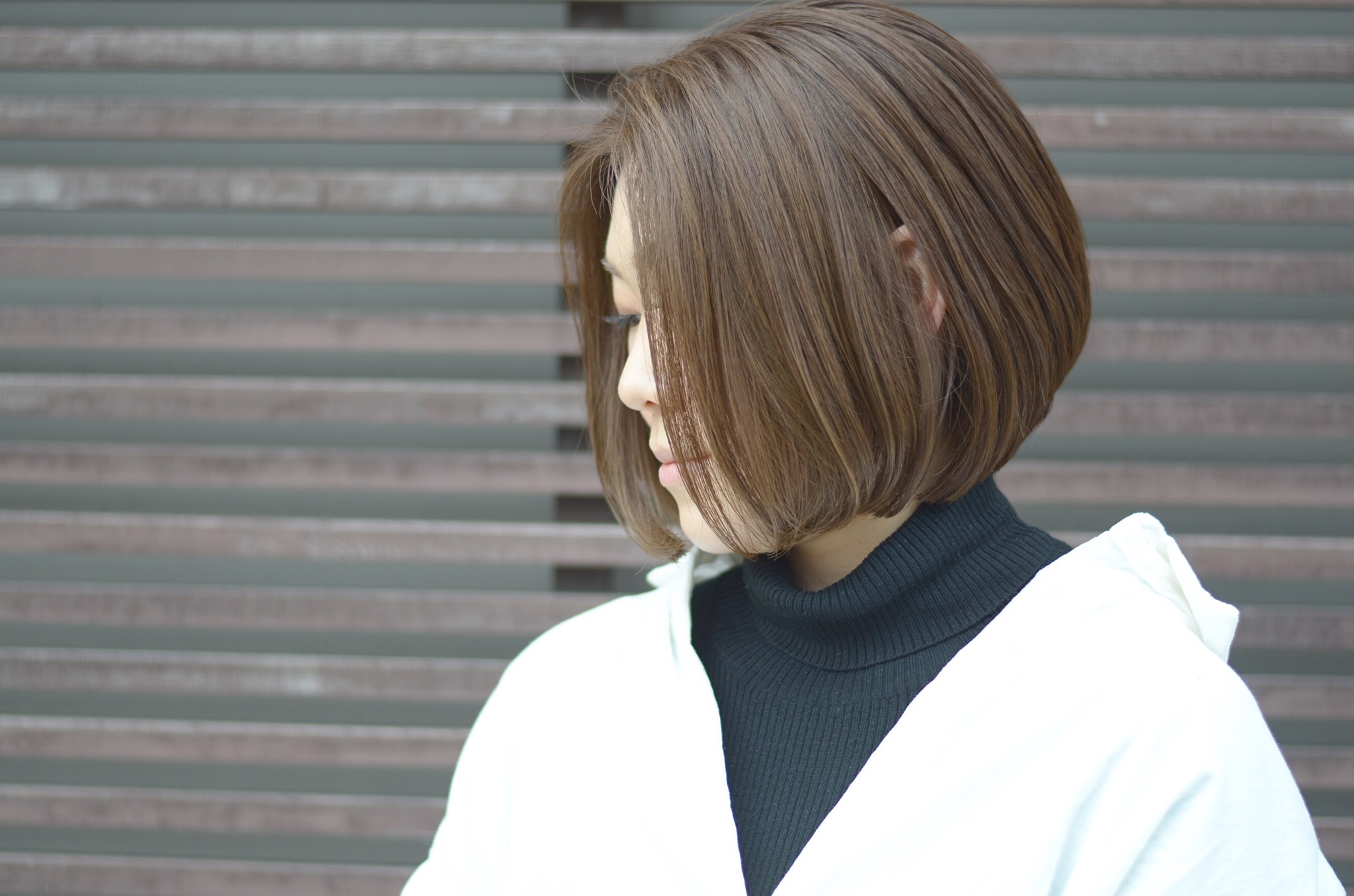 ベージュの透明感とツヤ、そしてボブのシルエットがシンプルですが