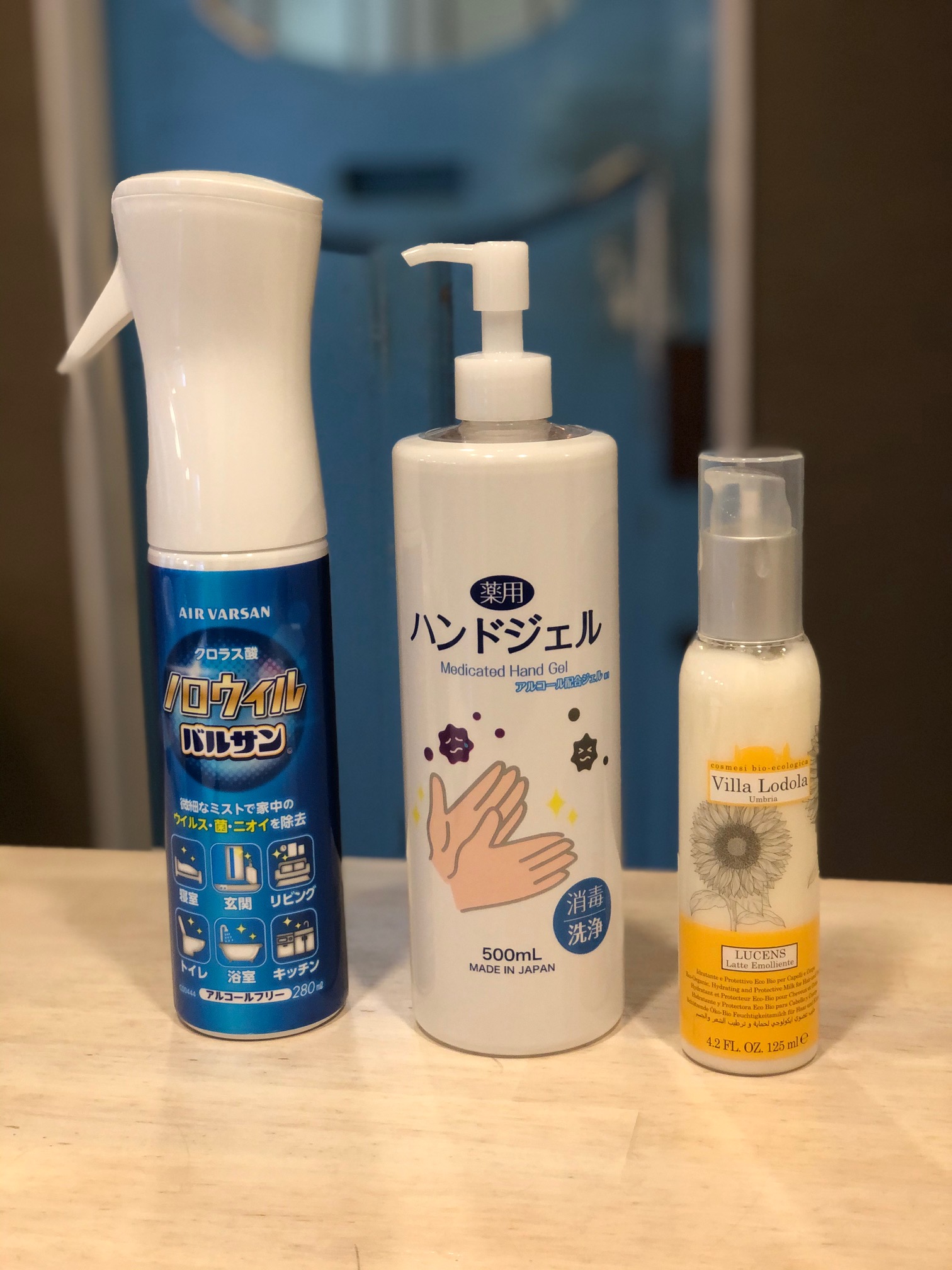 お店のフロントにアルコール手指消毒がございますので、ご来店時、お帰り時に