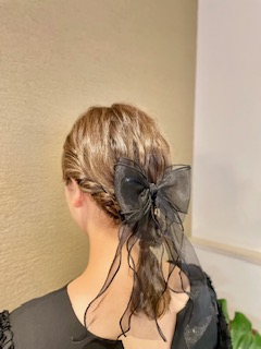 長さが足りなくならないように後ろは上下に分けて三つ編みをして、一つにまとめています☆